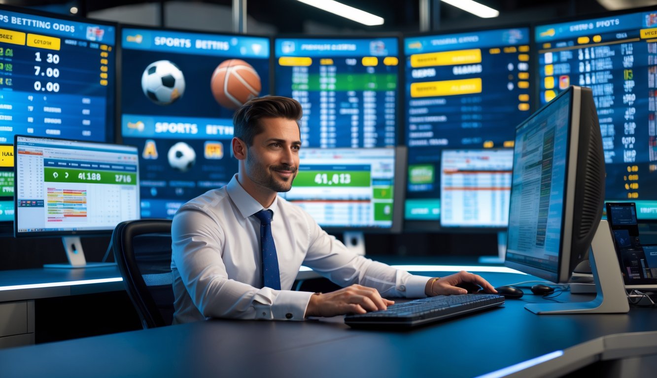 Seorang bandar bola profesional duduk di kantor modern dengan beberapa layar komputer yang menampilkan pertandingan olahraga dan peluang taruhan.